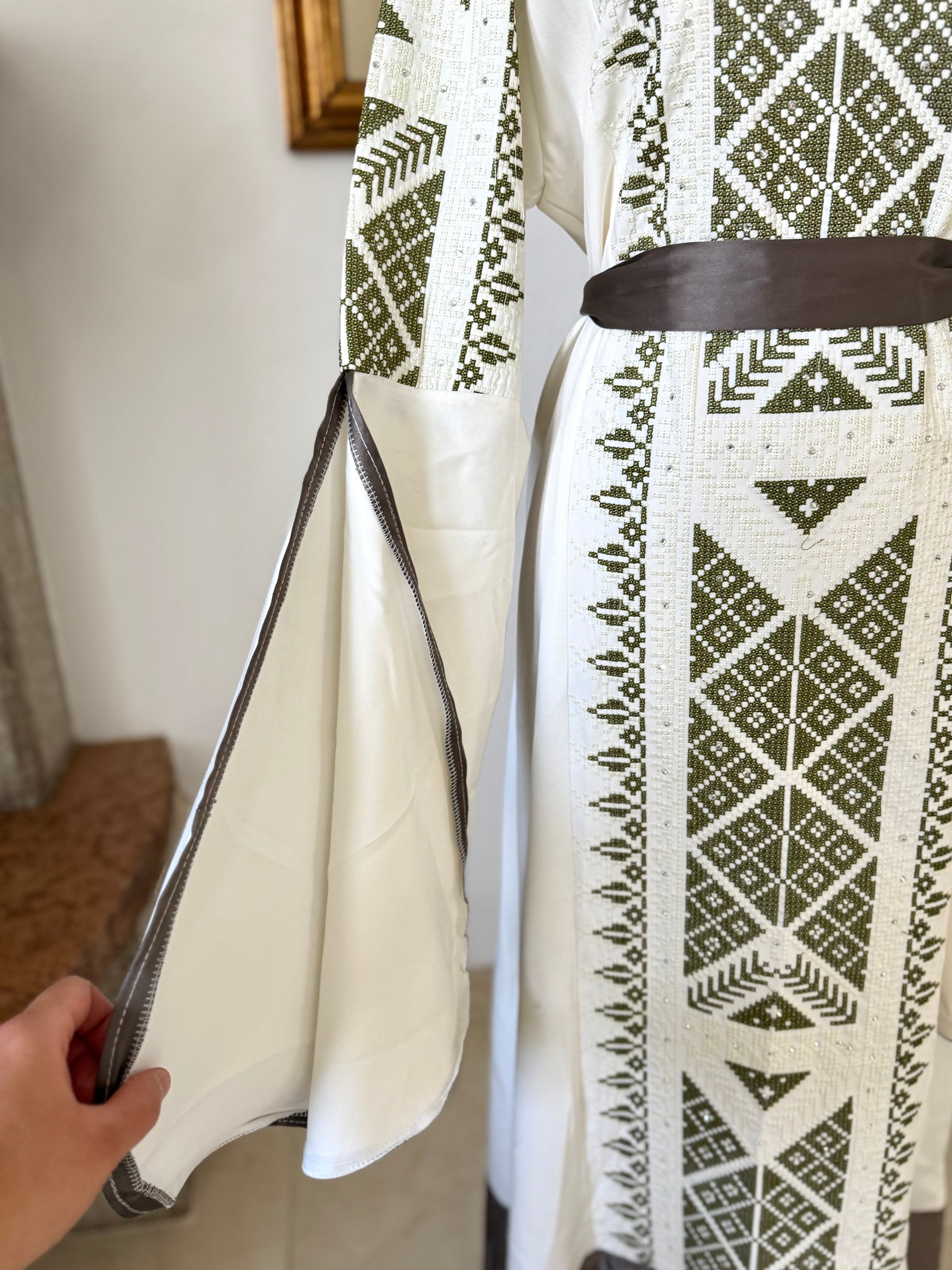 Elegante e moderna, questa abaya bianca è impreziosita da tatreez verde e valorizzata da una cintura marrone che definisce la vita. Le maniche ampie e aperte donano movimento e stile, rendendola perfetta per ogni occasione, con un tocco unico di artigianato palestinese.