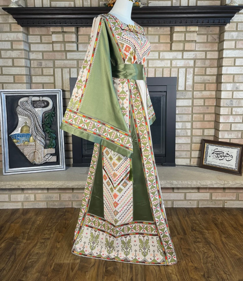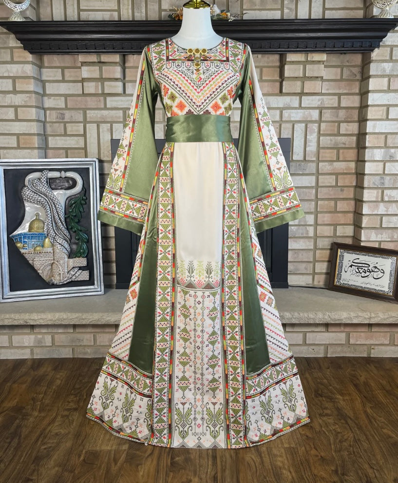 Akka, ispirato alla storica città palestinese di Acri, unisce fascino e tradizione in un design unico. L'abito bianco e verde è impreziosito da tatreez colorati, che richiamano i motivi antichi dei mercati e dei porti della città. Un capo che evoca storia, eleganza e movimento, perfetto per chi desidera indossare la bellezza di un patrimonio culturale ricco e vibrante.