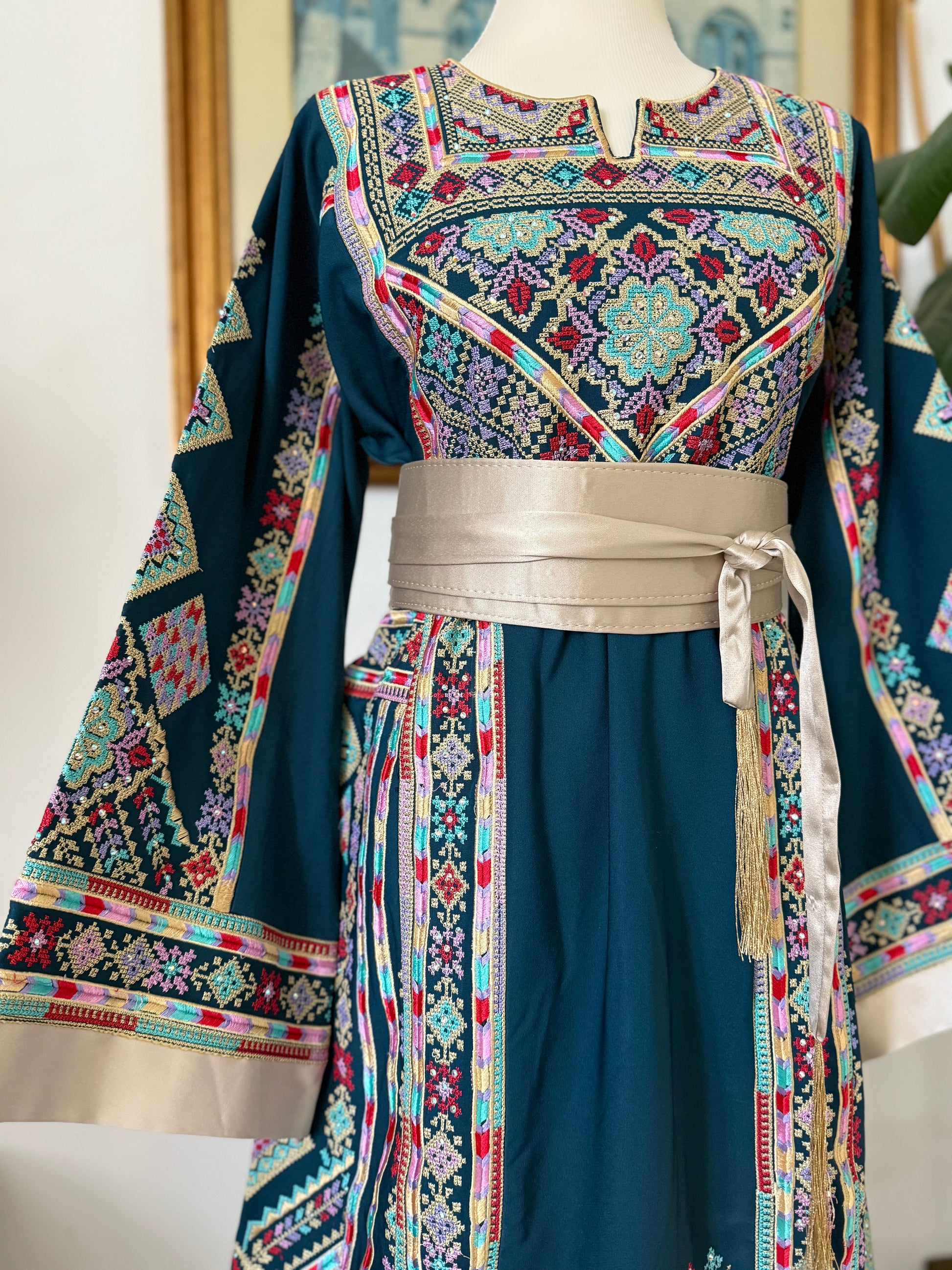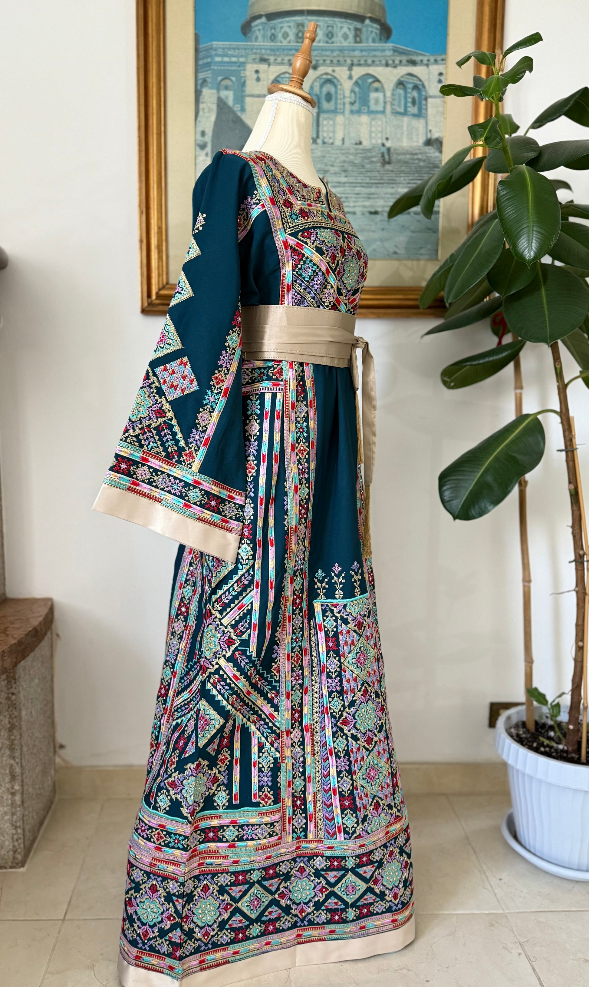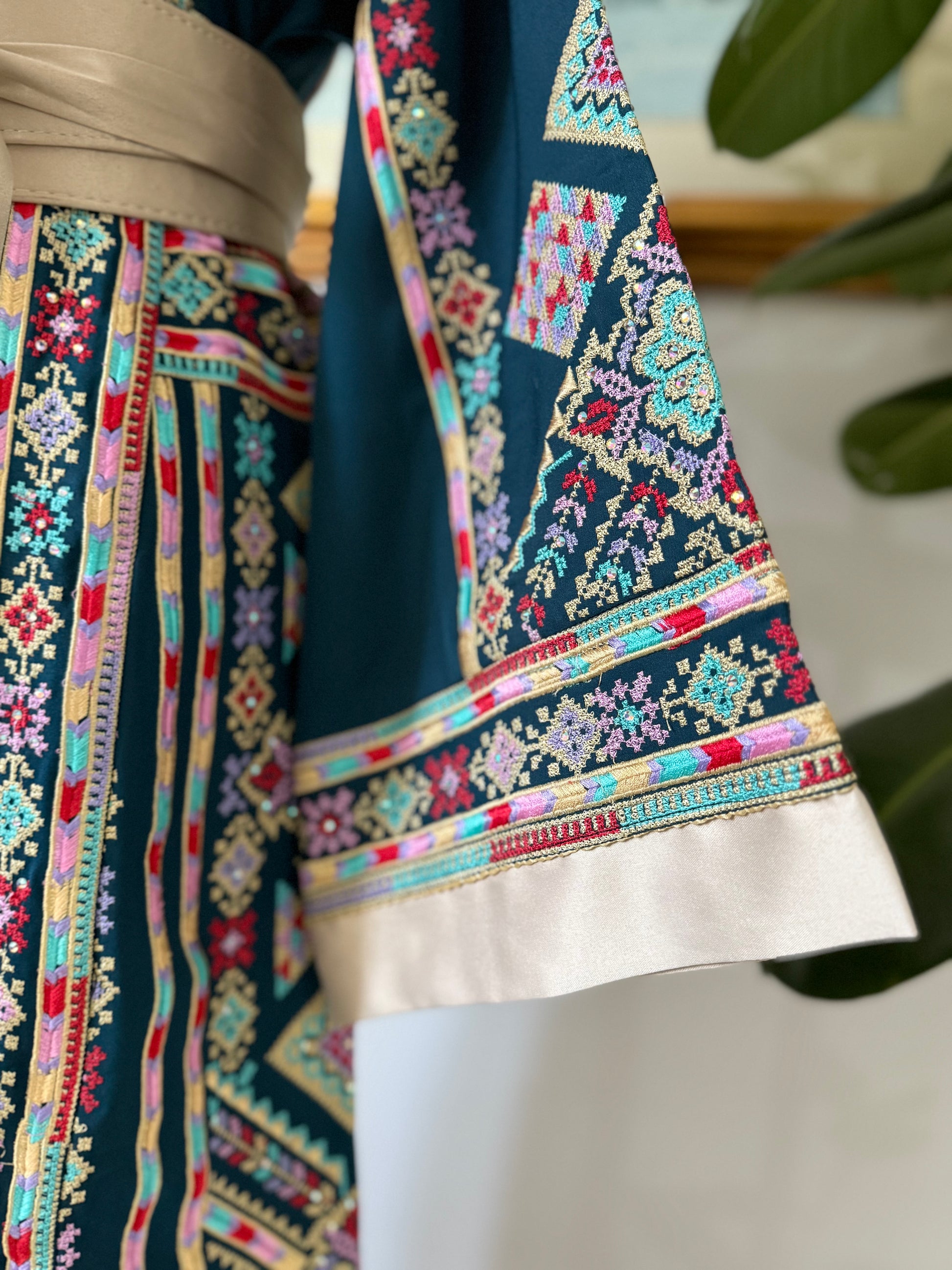 Liyan, in arabo, significa delicatezza e morbidezza, e questo abito ne è la perfetta espressione. Il verde petrolio si unisce ai ricami tatreez multicolori, creando un equilibrio armonioso tra profondità e vivacità. Un capo raffinato, ricco di identità e movimento, pensato per chi ama l'eleganza che parla con dolcezza.