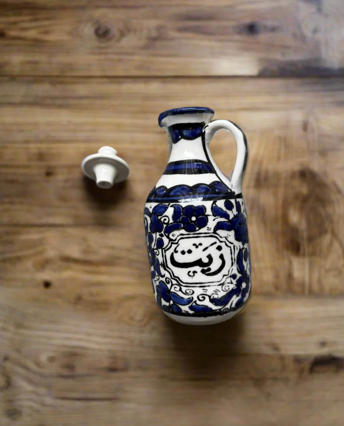 Realizzata interamente a mano da maestri ceramisti palestinesi, ogni oliera è un pezzo unico: forme morbide, colori caldi e decorazioni tradizionali che raccontano una storia di cultura, resilienza e bellezza.