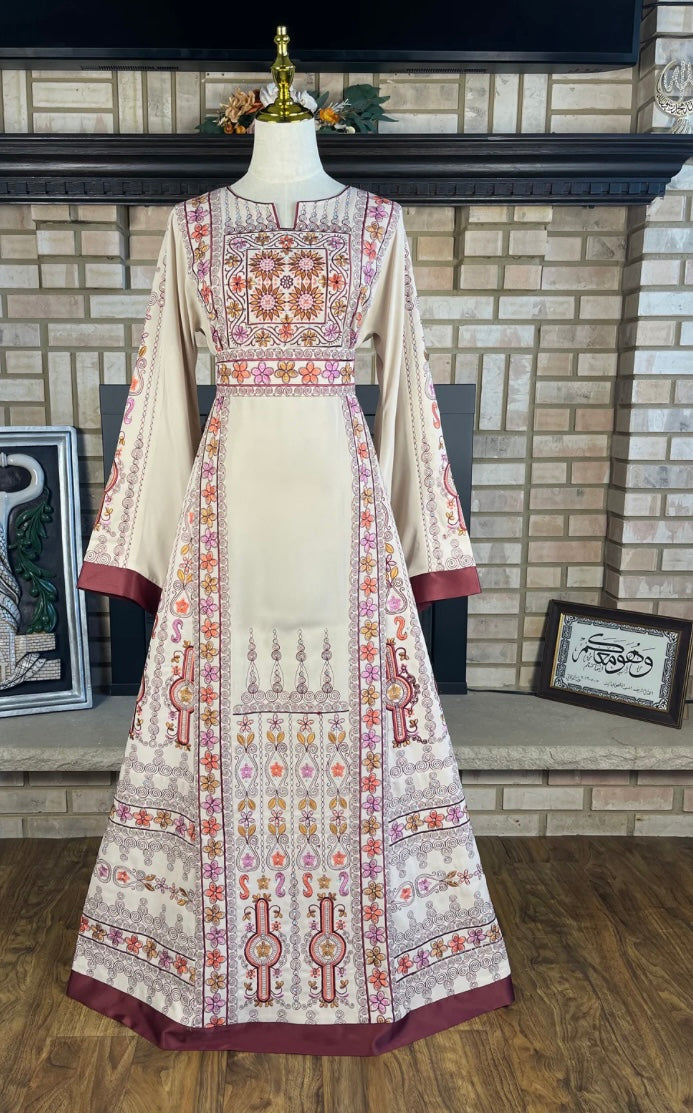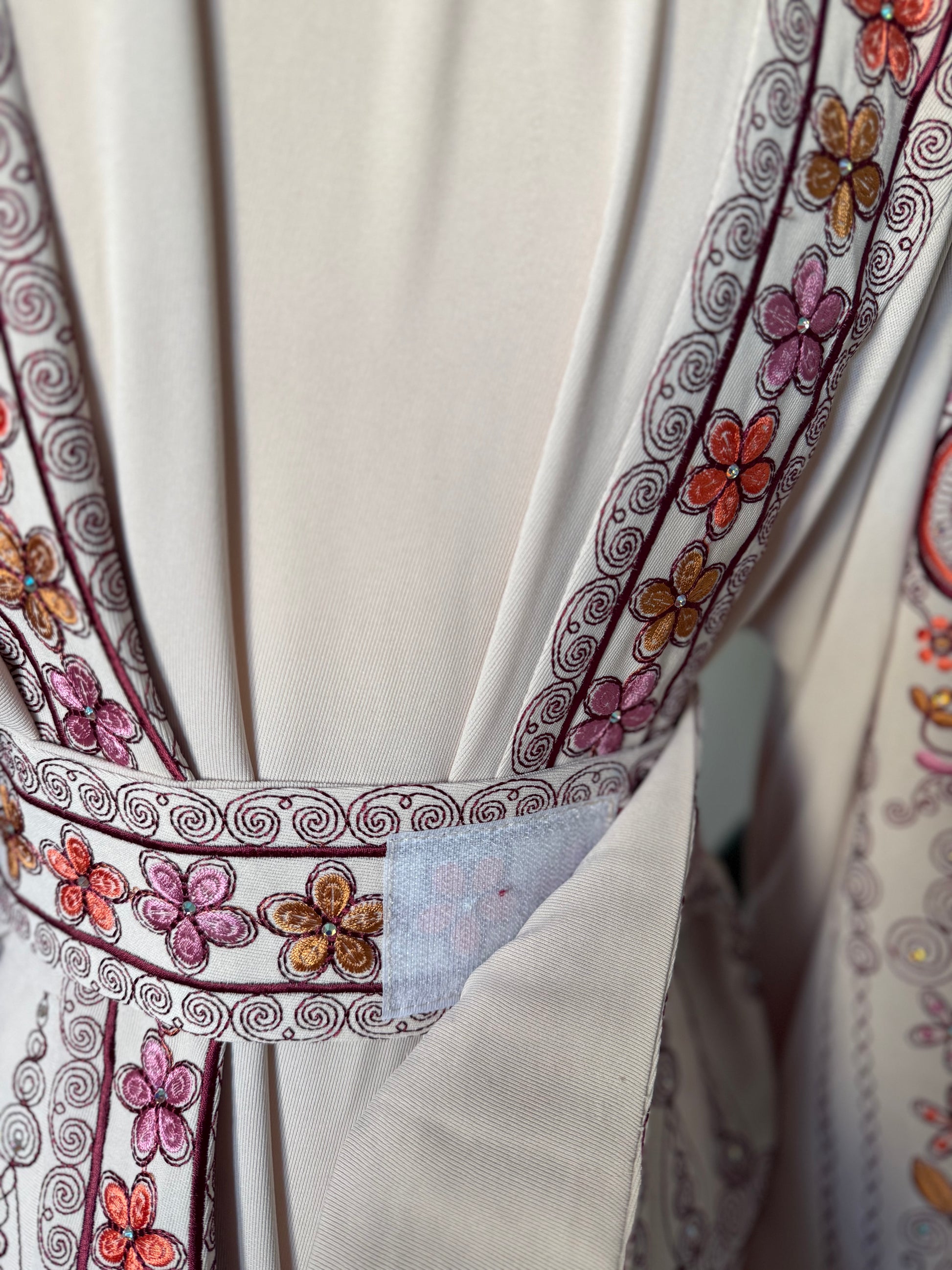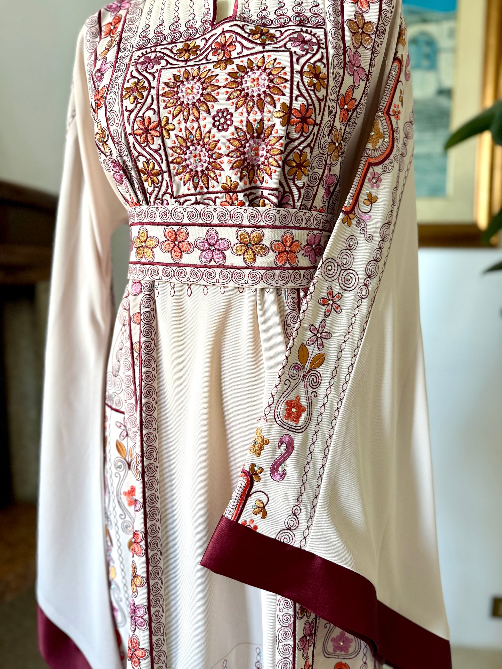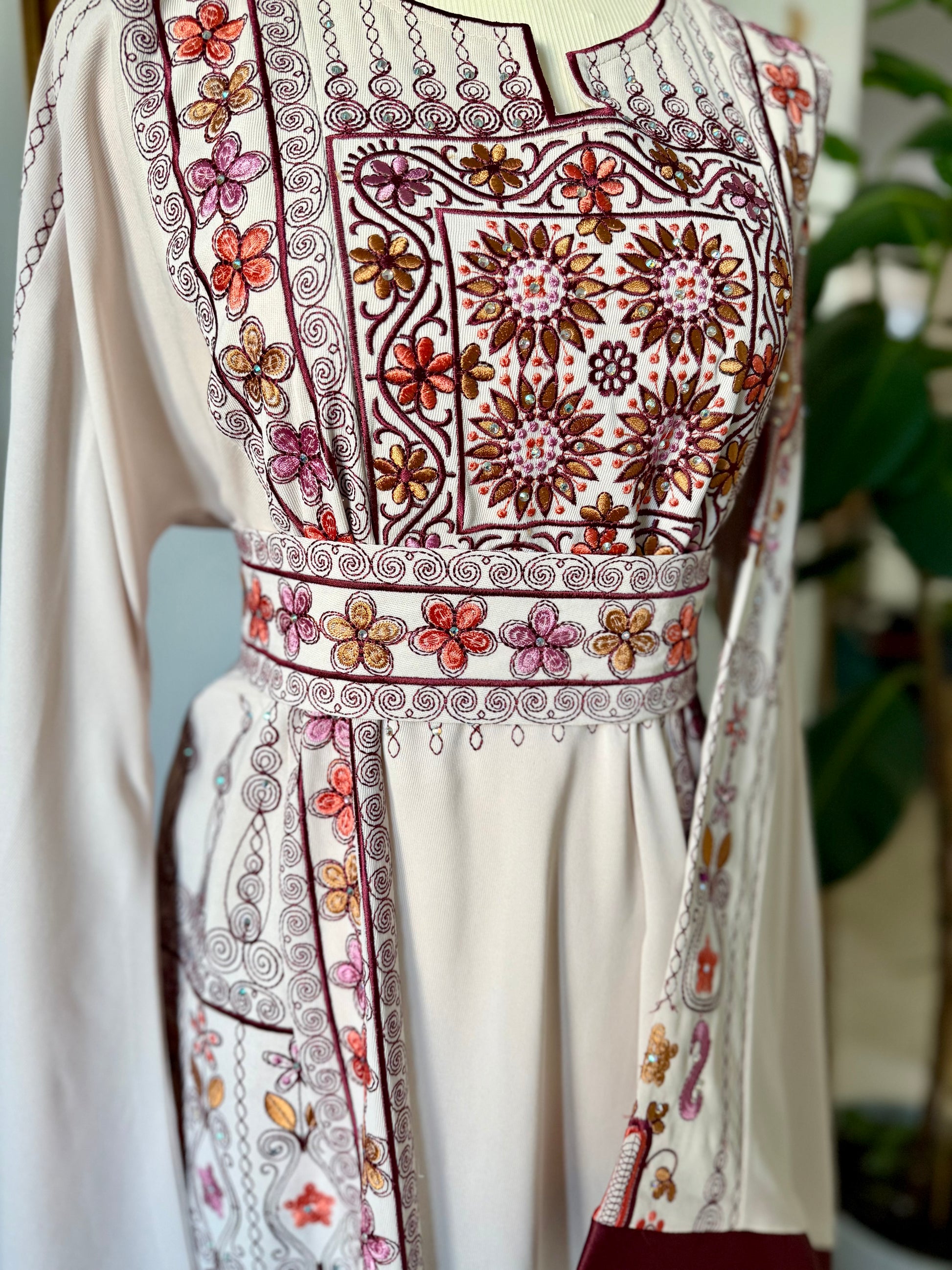 Fulla, nome ispirato al fiore bianco simbolo di purezza ed eleganza, rappresenta la femminilità più raffinata. Il candore del tessuto si armonizza con i tatreez floreali rosa, creando un equilibrio dolce e luminoso. Un abito che celebra la grazia, la tradizione e la bellezza senza tempo dell'artigianato palestinese.