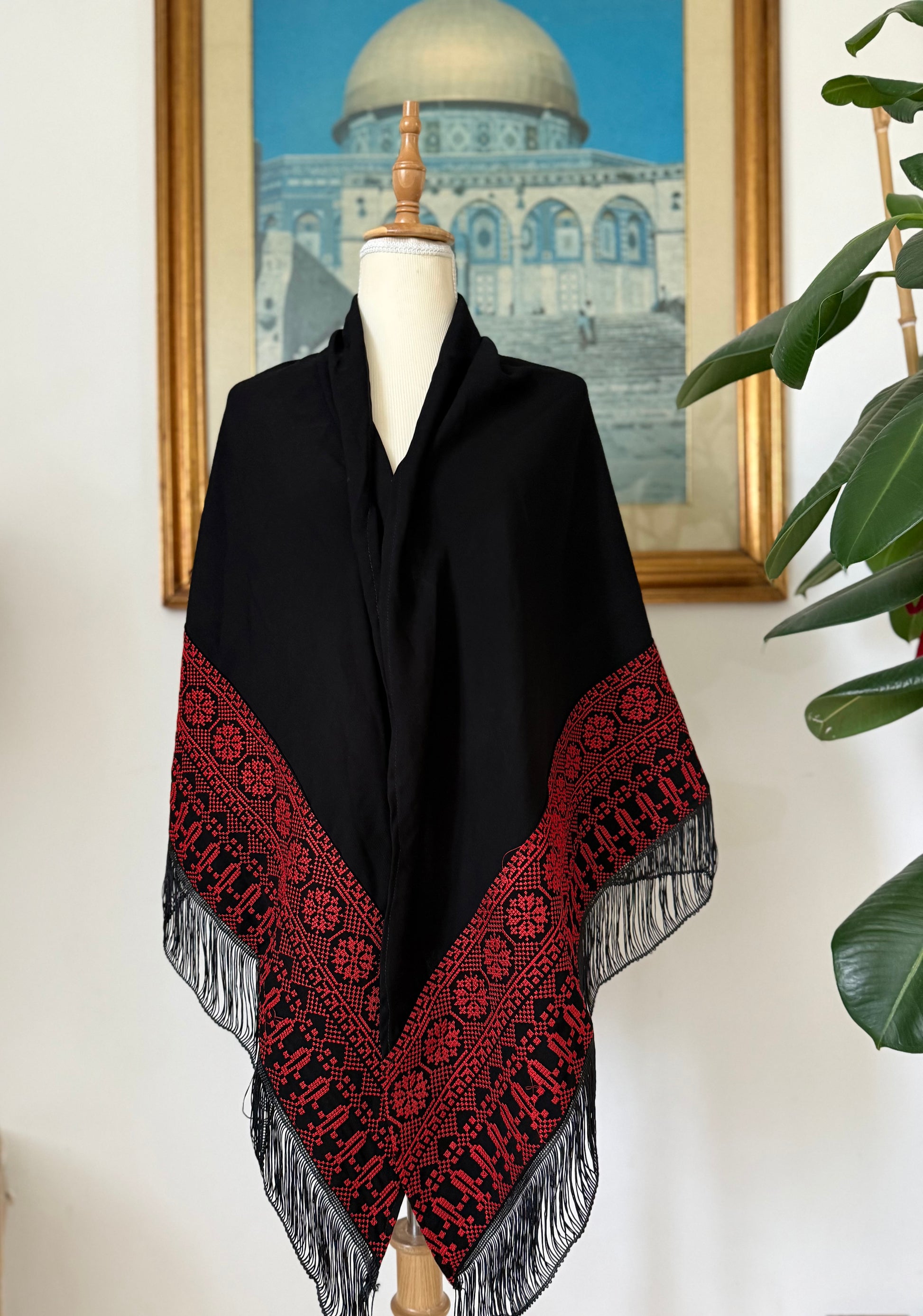 Scialle nero con tatreez rosso.