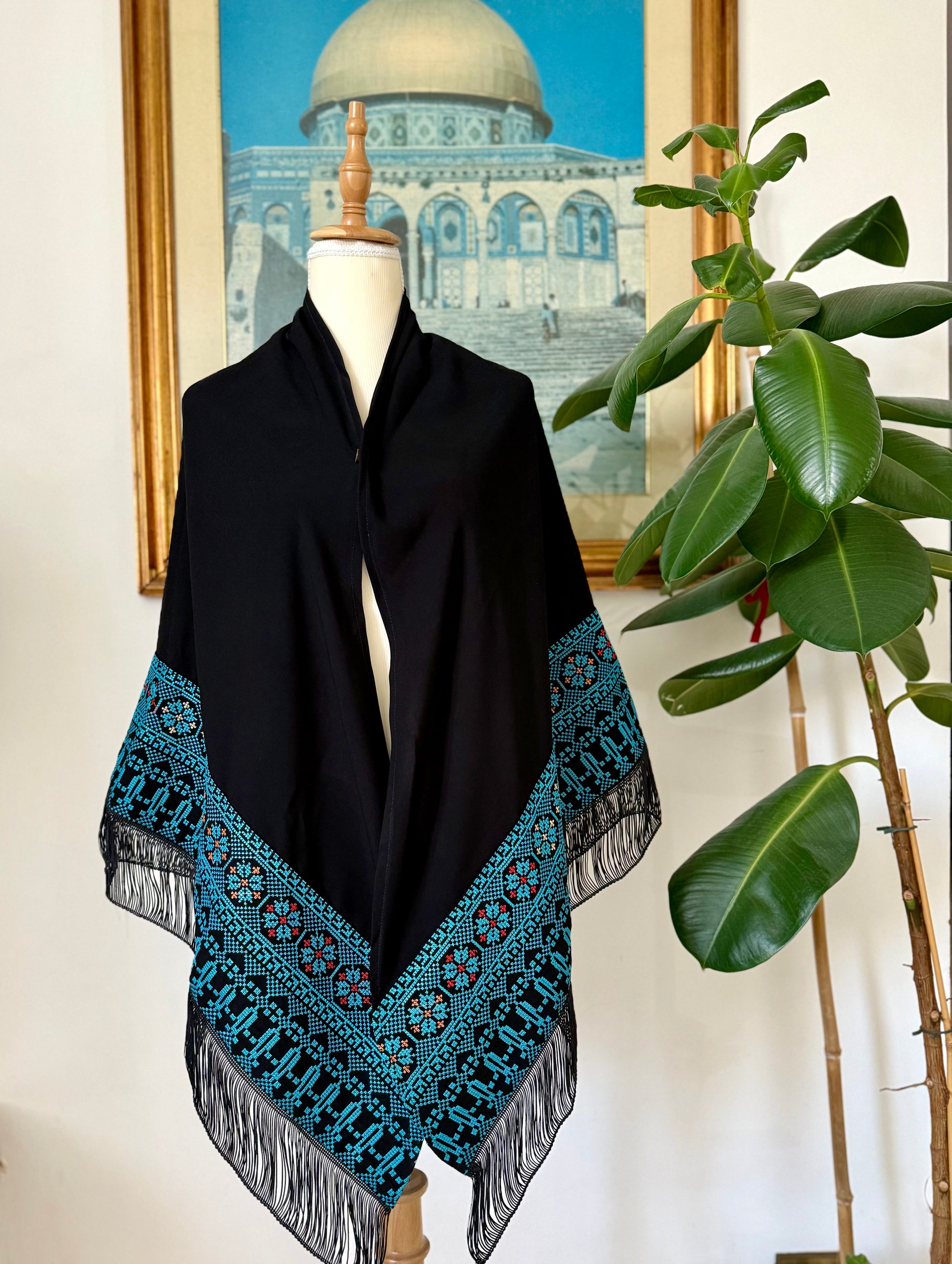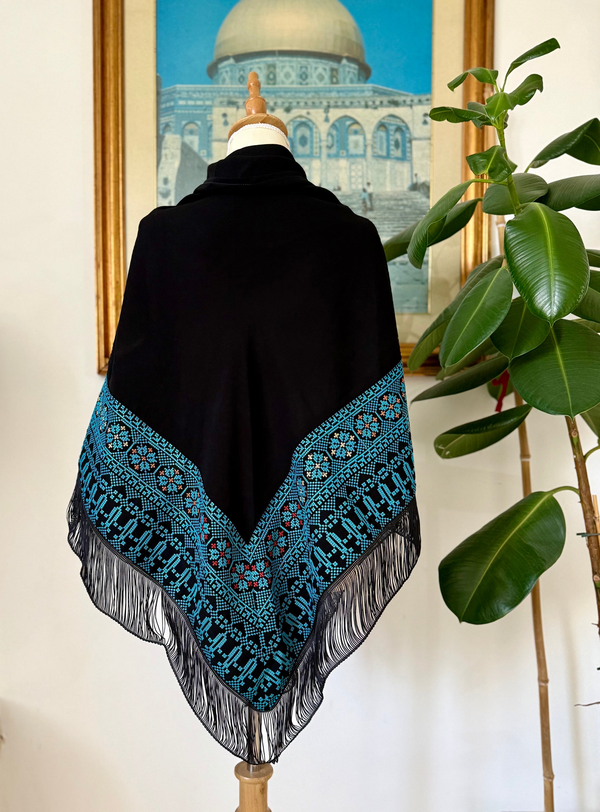 Scialle nero con tatreez azzurro.